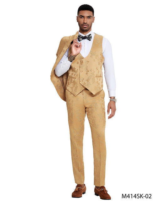 Gold Floral Wide Peak Lapel 3 Piece Double Breasted Vest Skinny Fit Tazzio Men's Suit With Matching Bow TieRegular price $179.99 USDRegular priceUnit price / per-