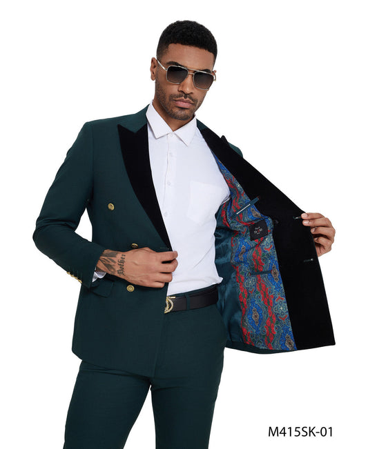 Green Double Breasted Velvet Peak Lapel 2 Piece Gold Buttons Skinny Fit Tazzio Men's SuitRegular price $179.99 USDRegular priceUnit price / per-