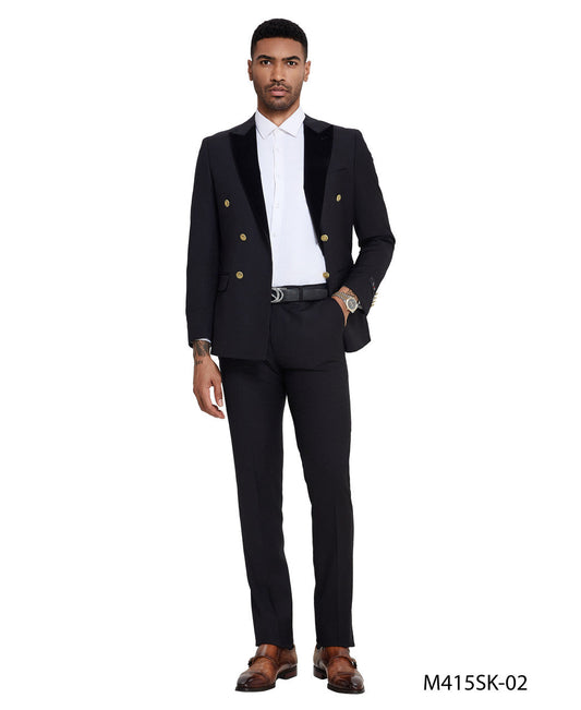 Black Double Breasted Velvet Peak Lapel 2 Piece Gold Buttons Skinny Fit Tazzio Men's SuitRegular price $179.99 USDRegular priceUnit price / per-
