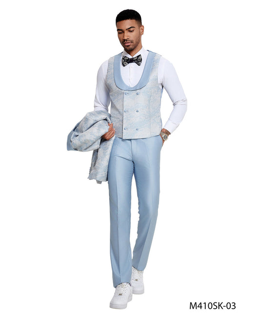 Sky Blue Paisley Wide Shawl Lapel 3 Piece Skinny Fit Tazzio Men's Suit With Matching Bow TieRegular price $179.99 USDRegular priceUnit price / per-