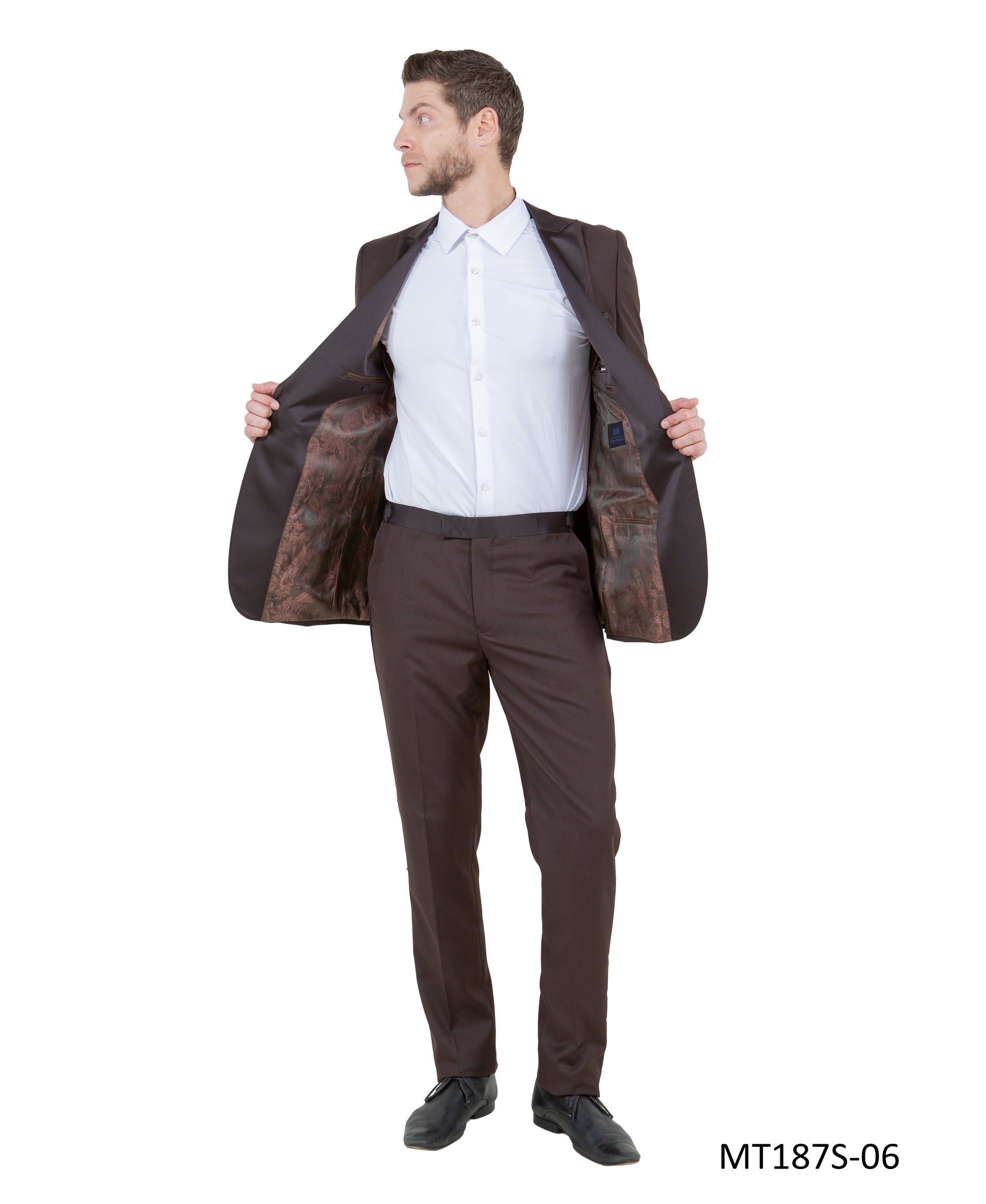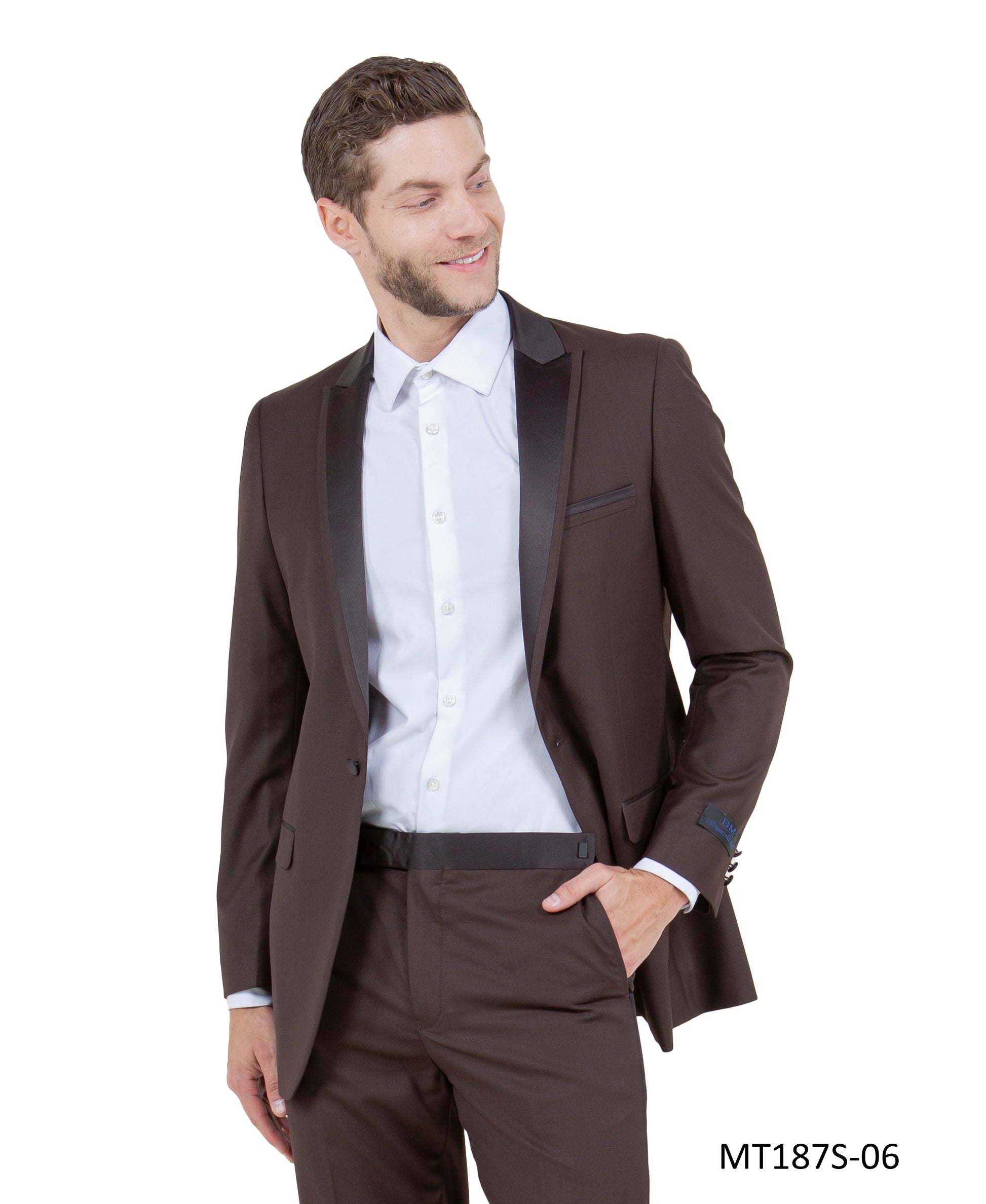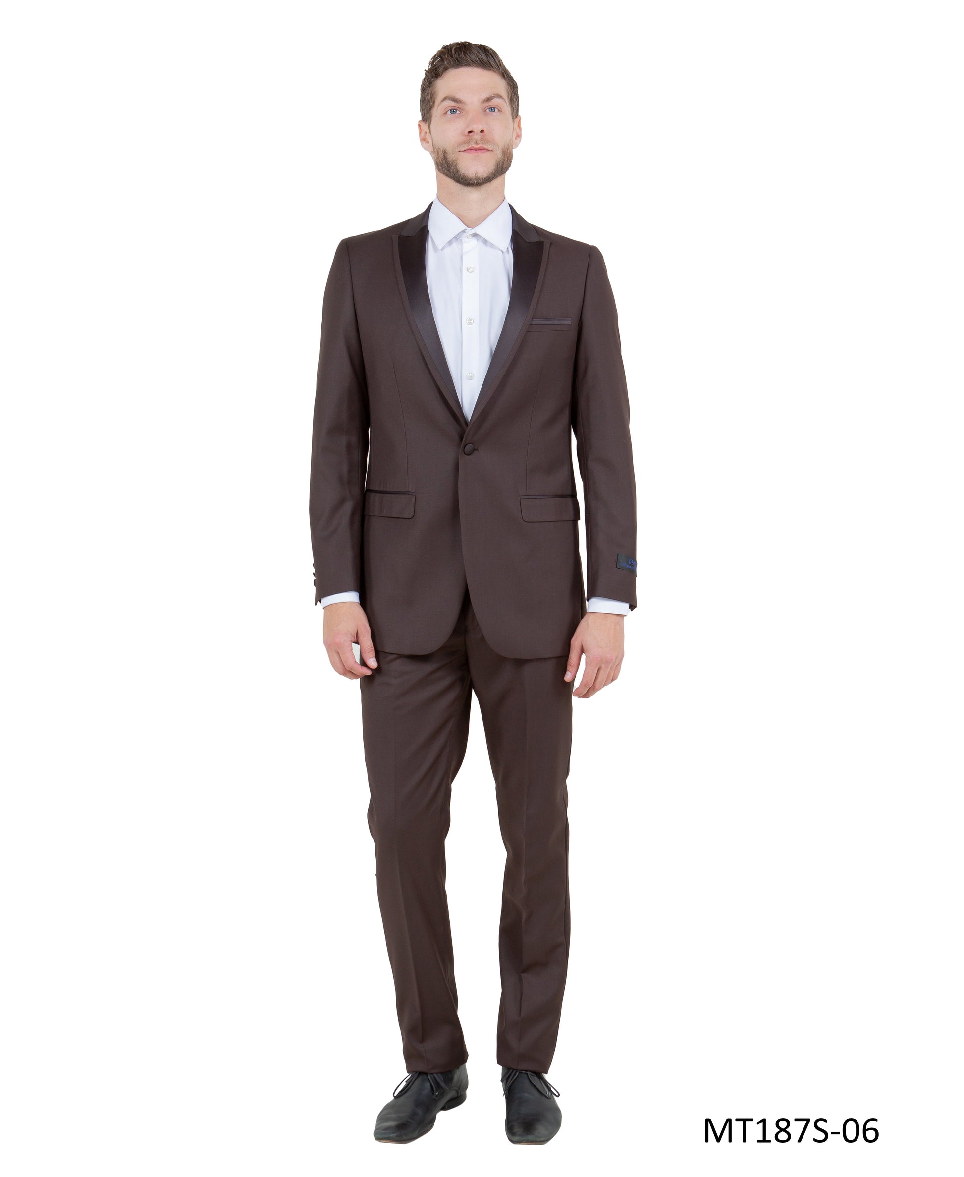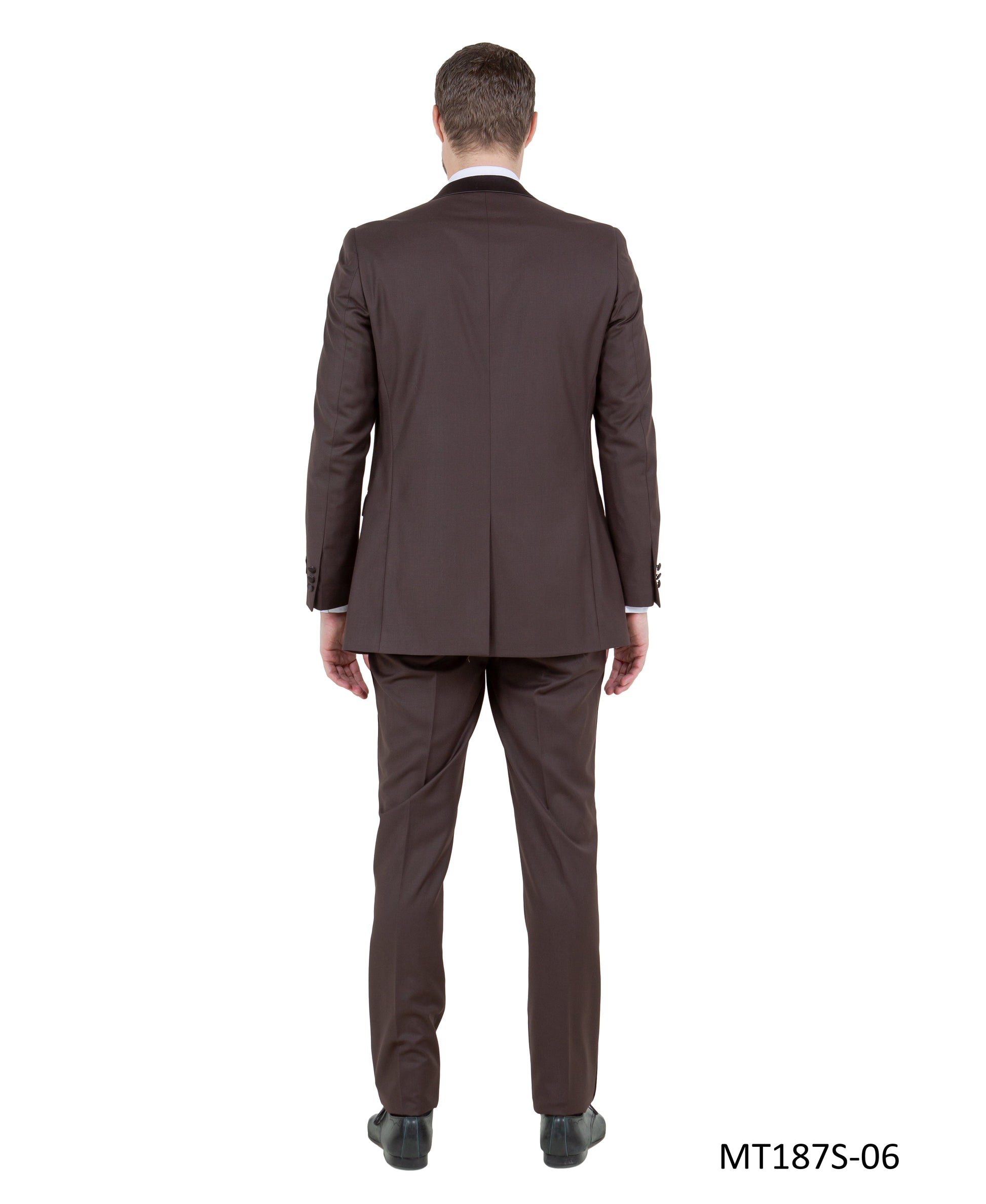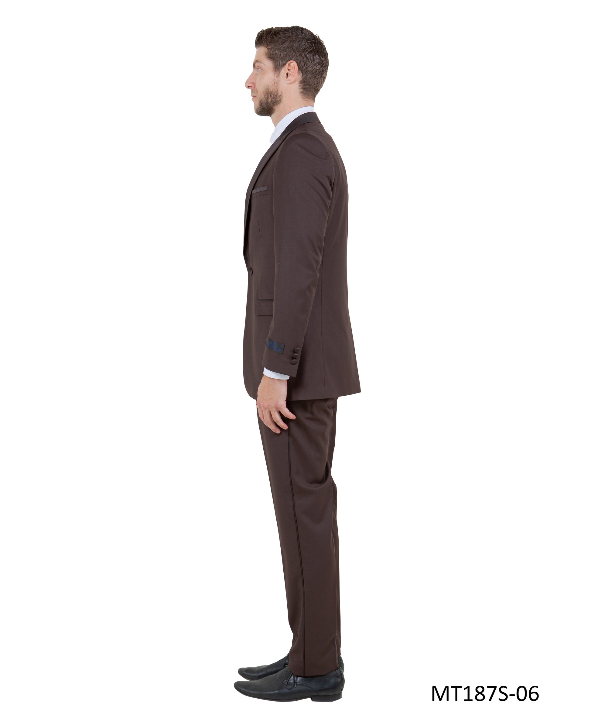 Brown on Brown Satin Peak Lapel With Fabric Trim Slim Fit 2 Piece Bryan Michaels Men's Tuxedo